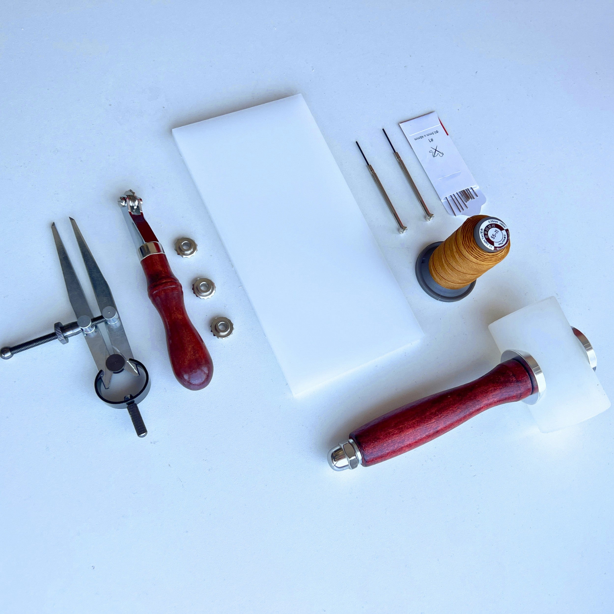 • marcadores de cuero • cúter • tijeras • pincel para aplicar pegamento • 3 piezas de papel de lija • cuchillo para herramientas de cuero • 3 milímetros Perforadora de agujeros redondos • Martillo para zapatero • Biseladora de seguridad para cuero • Clavos para montar calzado a mano • Tenazas para montar zapatero