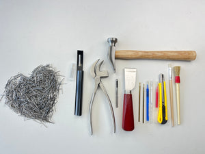• leather marking pens • cutter knife • brush for applying glue • leathercraft tool knife • 3 mm round hole punch • shoemaking hammer • Leather Safety Beveler • Lasting nails for Hand Shoemaking • Shoemaker lasting pincers.