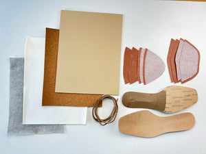 • 2 pairs of toe puffs • 2 pairs of counter stiffeners • 1 pair of insoles • 1.5 meters of welt • Self-adhesive fiberglass reinforcement tape • Self-adhesive 2mm foam for foot comfort • 1 sheet of 3mm cork • 2 sheets of 3mm Thunit soling and heeling material